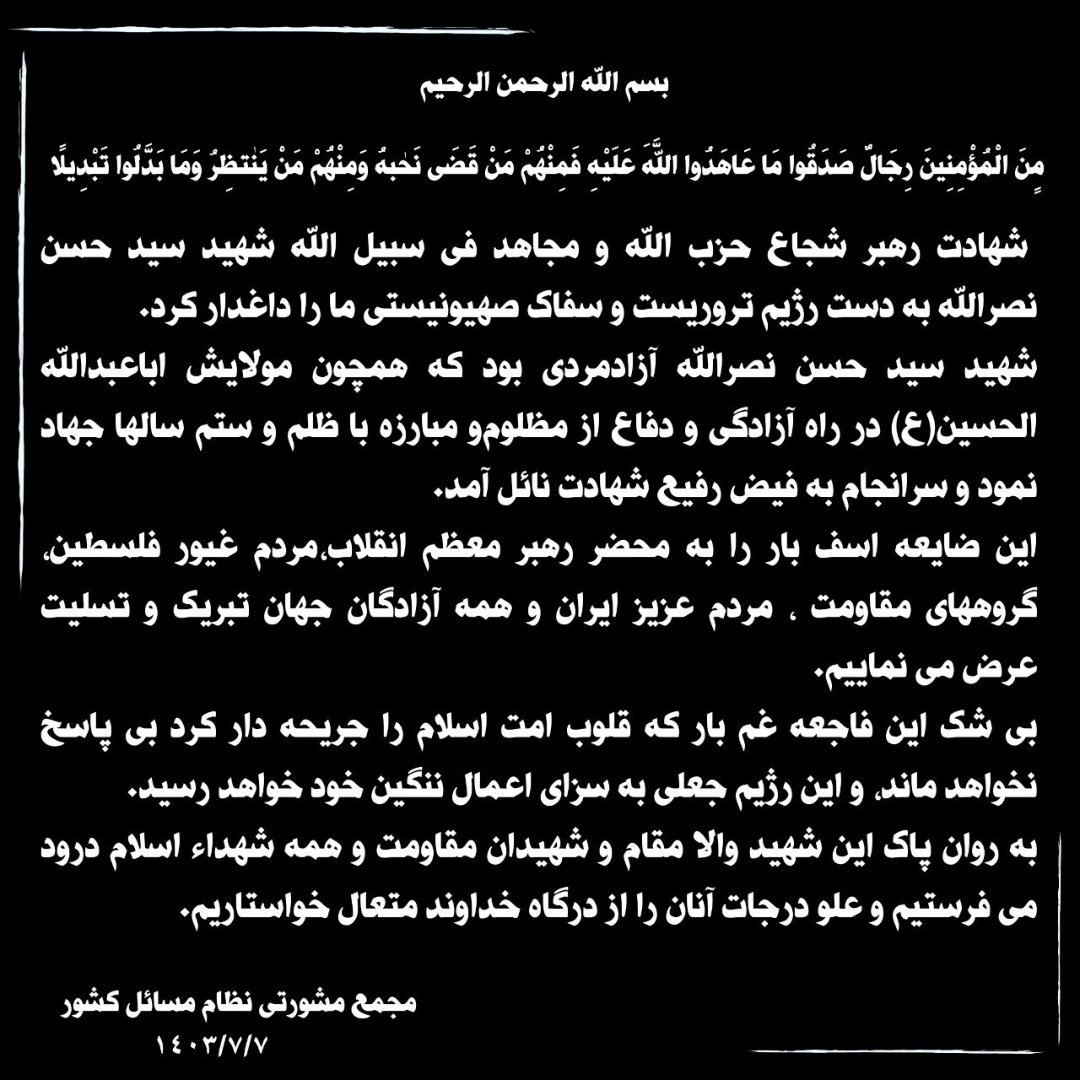 به گزارش روابط عمومی مجمع مشورتی نظام مسائل کشور این مجمع درپی شهادت دبیر کل حزب الله لبنان شهید سید حسن نصرالله پیام تسلیتی صادر کرد.