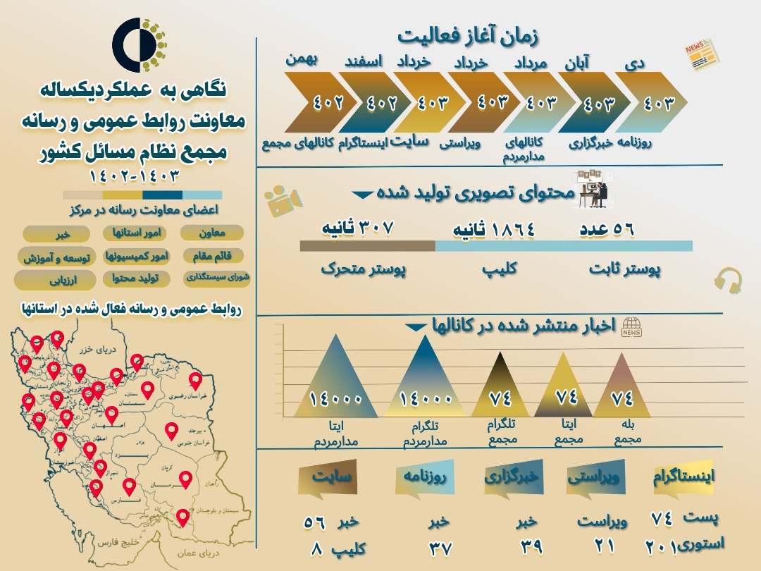 معاونت روابط عمومی و رسانه مجمع نظام مسائل کشور از بهمنماه ۱۴۰۲ فعالیت خود را آغاز نموده است و تاکنون با بهرهگیری از ظرفیتهای تخصصی خود در قالب شش واحد خبر، امور کمیسیونها، امور استانها، تولید محتوا، نظارت و ارزیابی، آموزش و توسعه و ۲۴ معاون رسانه در استانهای کشور،سعی نموده است گامهای مؤثری در راستای تقویت ارتباطات رسانهای و افزایش حضور در فضای رسانهای کشور بردارد. این معاونت با برنامهریزی منسجم و همکاری مستمر واحدها و اعضا در کل کشور، توانسته است روند تولید و انتشار محتوای رسانهای را در پلتفرمهای مختلف گسترش دهد.